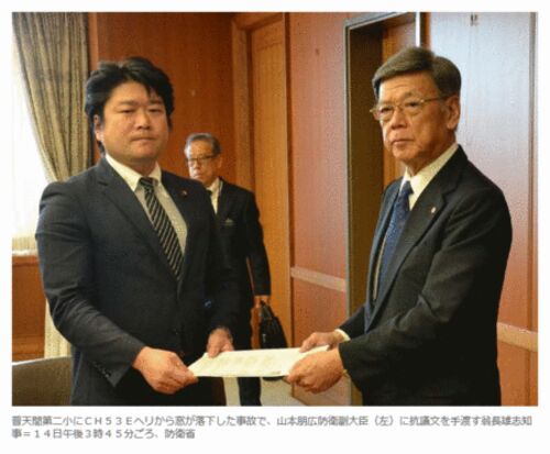 2017-12-14 翁長知事「沖縄県民、憤っている」 米軍ヘリ窓落下、上京し抗議 2017年12月15日 05:00 【東京】米軍普天間飛行場所属のCH53E大型輸送ヘリの重さ7・7キロの窓が、宜野湾市立普天間第二小の運動場に落下した事故で、沖縄県の翁長雄志知事は…